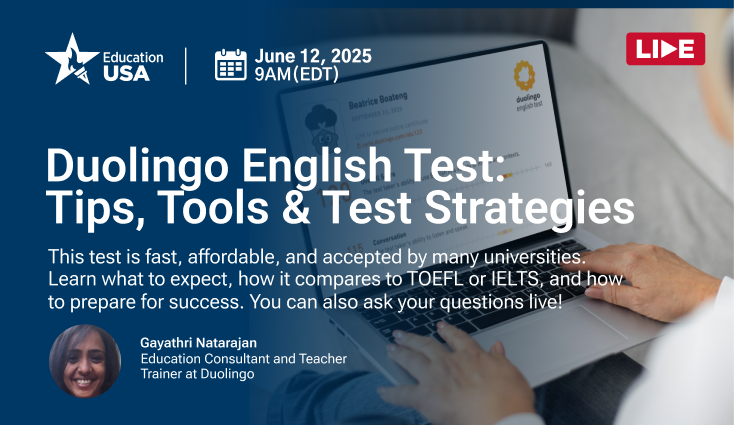 Are you considering the Duolingo English Test for your university or scholarship application? Join EducationUSA for a live Q&A session with certified Duolingo trainer Gayatri Natrajan to learn everything you need to know about this fast, affordable, and widely accepted English proficiency test. This session will cover how the test works, how it compares to TOEFL and IELTS, what to expect on test day, and how to prepare effectively using Duolingo’s tools. You’ll also have the chance to ask your questions live. This webinar is ideal for international students exploring flexible English testing options.