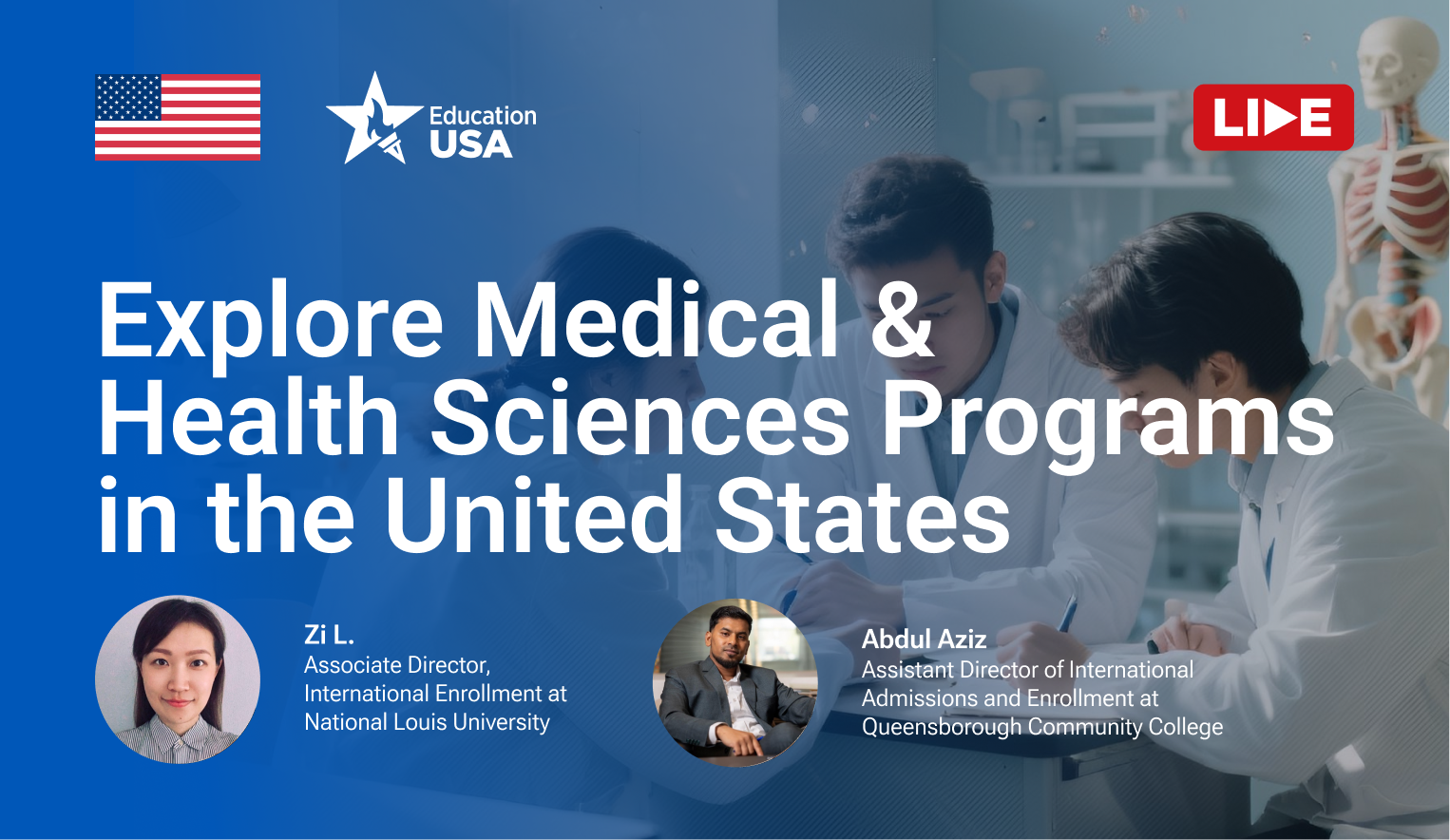 Join us for an engaging session on Medical & Health Sciences programs in the United States. Our guest speakers — Abdul Aziz, Assistant Director of International Admissions & Enrollment at Queensborough Community College (CUNY), and Zi Lin, Associate Director of International Enrollment at National Louis University— will share valuable insights on studying Nursing and other Health Sciences programs, as well as tips on the application process for international students. Key Topics