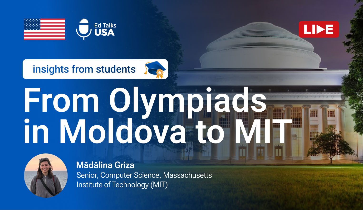 Join us for an inspiring session with Mădălina Griza, a Moldovan student and current senior at the Massachusetts Institute of Technology (MIT). Mădălina is majoring in Computer Science with a minor in Media Studies, and her academic path began with a strong foundation in Mathematics and Informatics Olympiads in Moldova. These experiences fueled her passion for problem solving, innovation, and technology—ultimately shaping her successful application to MIT. ━━━━━━━━━━━━━━ * Click here to convert the time to your local time zone. * Full recording will be available after the event on ourEducationUSA Virtual YouTube channel.