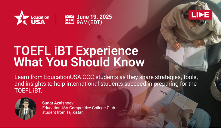 This webinar offers practical, experience-based insights into preparing for the TOEFL iBT exam. Participants will hear how international students approach test preparation, manage time, choose effective study tools, and overcome common challenges. Key topics include: – Understanding the TOEFL iBT format and sections – Strategies for improving reading, listening, speaking, and writing – Recommended preparation resources and tools – Common mistakes and how to avoid them – How the TOEFL score fits into the U.S. admissions process Open to all international students planning to take the TOEFL iBT.