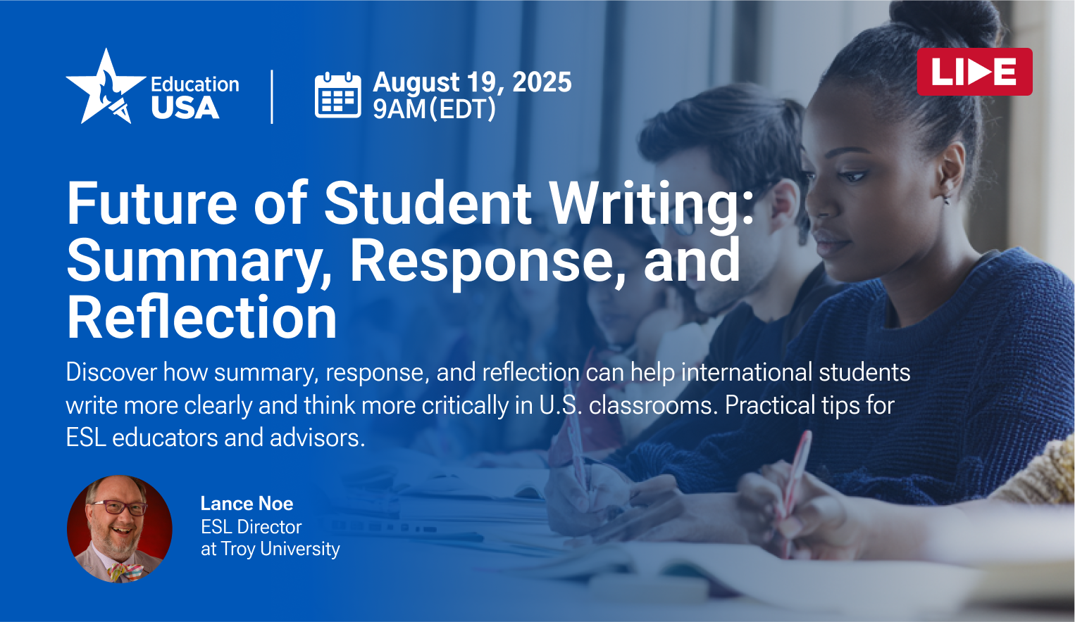 In this interactive webinar, Lance Noe will explore how student writing is evolving in academic settings, with a special focus on three foundational skills: summary, response, and reflection. Designed especially for international students and educators supporting English language learners, this session offers practical strategies to help build critical thinking and writing fluency.