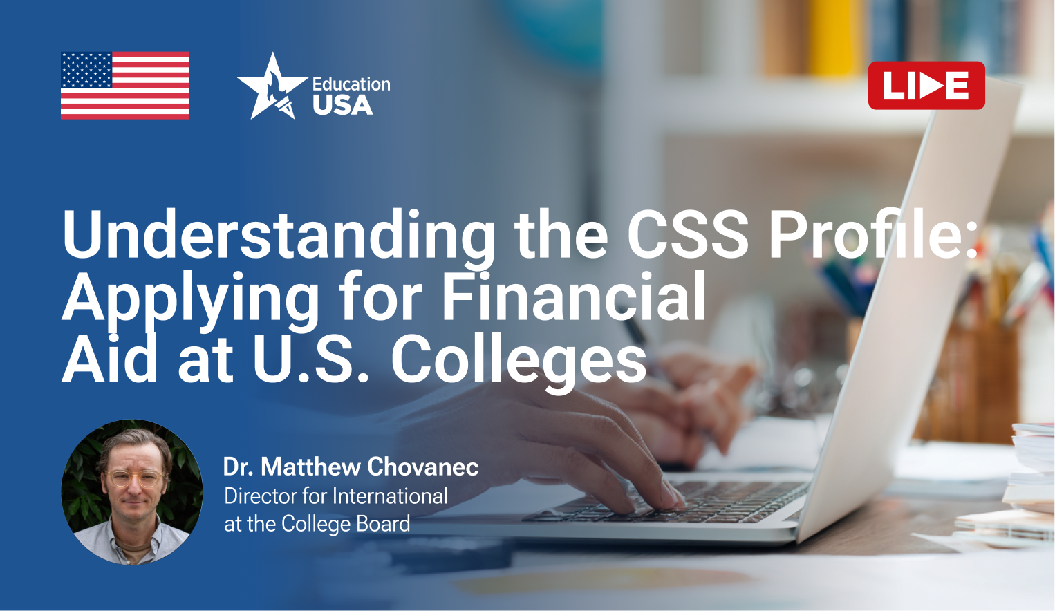 Planning to apply for financial aid at U.S. colleges and universities? Join us for a special webinar on the CSS Profile, a financial aid application used by hundreds of U.S. institutions to award non-federal aid. We’re excited to welcome Dr. Matthew Chovanec, Director for International at the College Board (Southwest Asia & North Africa). Dr. Chovanec will guide international students and families through the CSS Profile process and answer the most common questions. You’ll learn: