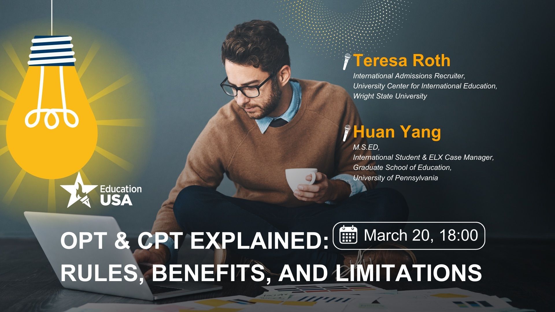 Дізнайтесь все про можливості проходження OPT та CPT від Teresa Roth, директорки з міжнародного рекрутингу в Wright State University, та Huan Yang, магістра наук у галузі освіти, менеджерки по роботі з міжнародними студентами та з питань освітньої лінгвістики (ELX, Educational Linguistics) в University of Pennsylvania.